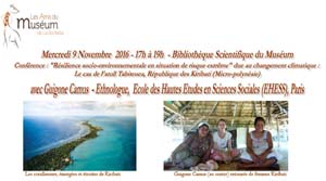 Ethnologue, Guigone Camus travaille dans l’archipel des Kiribati et plus spécifiquement sur l’atoll de Tabiteuea. Sa dernière mission, effectuée à la demande de l’Agence Française de Développement (Paris et Tahiti) et du Criobe (EPHE-CNRS-UPVD), visait à mieux comprendre les modes d’adaptation des insulaires de Tabiteuea face aux réchauffement global sur les environnements marins et terrestre des atolls de Kiribati, 33 confettis de corail disséminés dans 5 millions de km2 d’Océan Pacifique figurant parmi les plus vulnérables et les plus atteints par les conséquences du changement climatique : montée des eaux, modification des écosystèmes marins, fragilisation du couvert végétal, appauvrissement des ressources hydriques, constituent aujourd’hui de graves réalités.